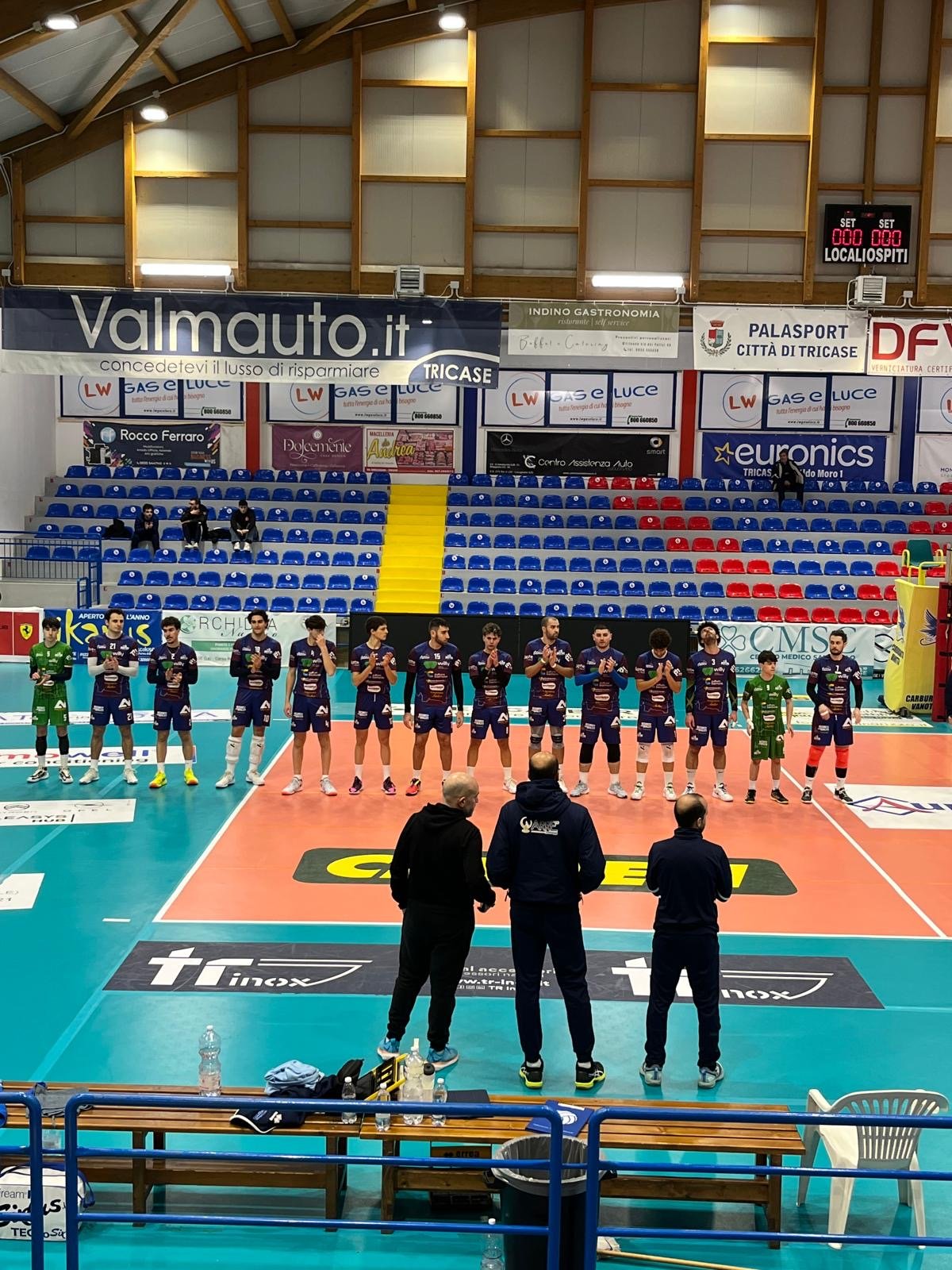 Locali subito in palla ed i biancoazzurri sono costretti subito ad inseguire. La rimonta però è parziale a metà set ma non completa perché il Tricase, spinto dal bomber polacco non perdona e acuisce gli errori degli ospiti chiudendo per 25-17 la prima frazione.