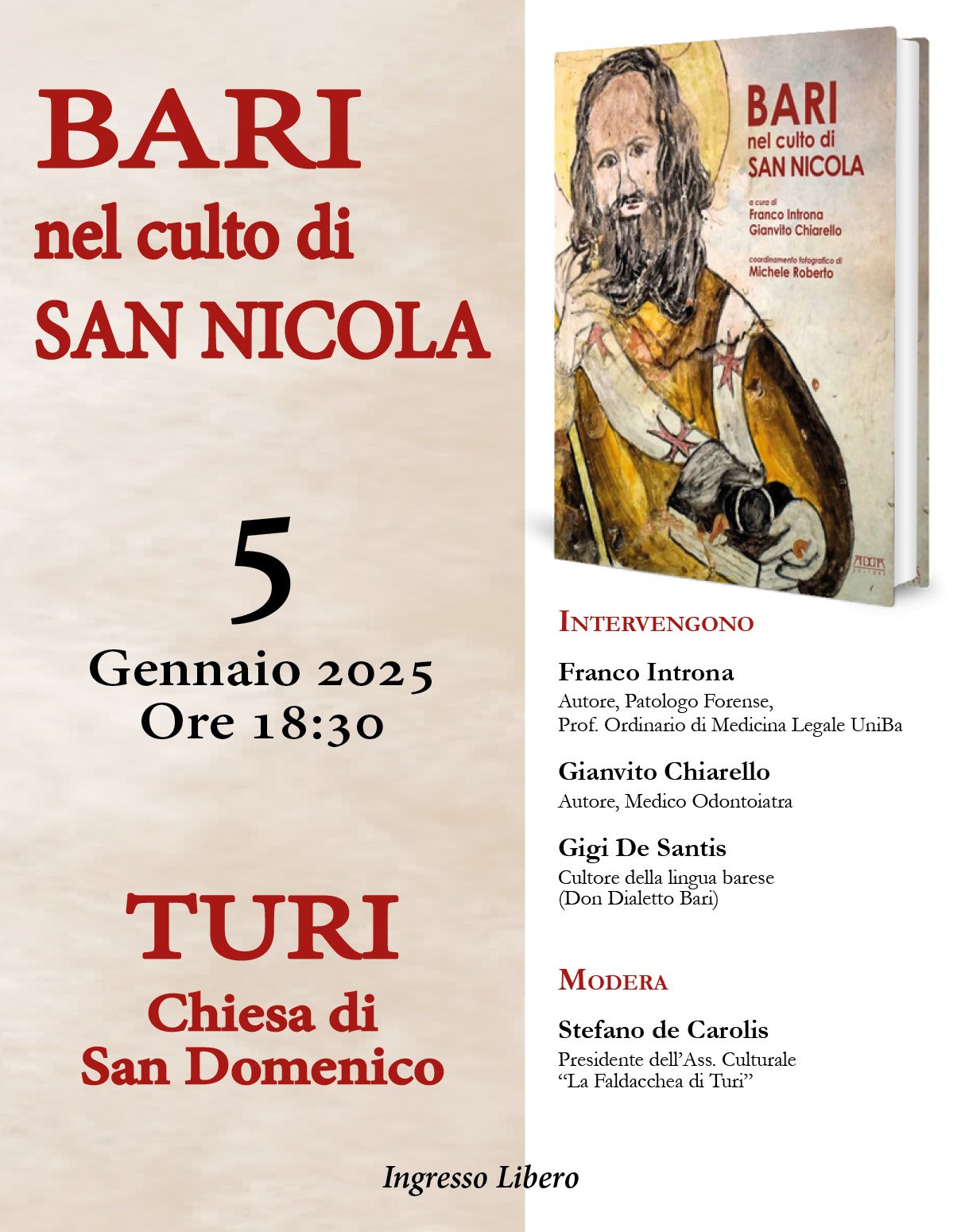 Domenica 5 gennaio, alle ore 18.30, nella Chiesa di San Domenico di Turi verrà presentato il libro dal titolo: “BARI nel culto di San Nicola”, di Franco Introna, (Prof. Ordinario UniBa, patologo forense) e Gianvito Chiarello (medico odontoiatra). Il volume è edito da ADDA Editore.