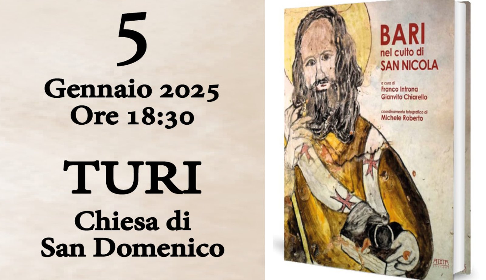 Domenica 5 gennaio, alle ore 18.30, nella Chiesa di San Domenico di Turi verrà presentato il libro dal titolo: “BARI nel culto di San Nicola”, di Franco Introna, (Prof. Ordinario UniBa, patologo forense) e Gianvito Chiarello (medico odontoiatra). Il volume è edito da ADDA Editore.