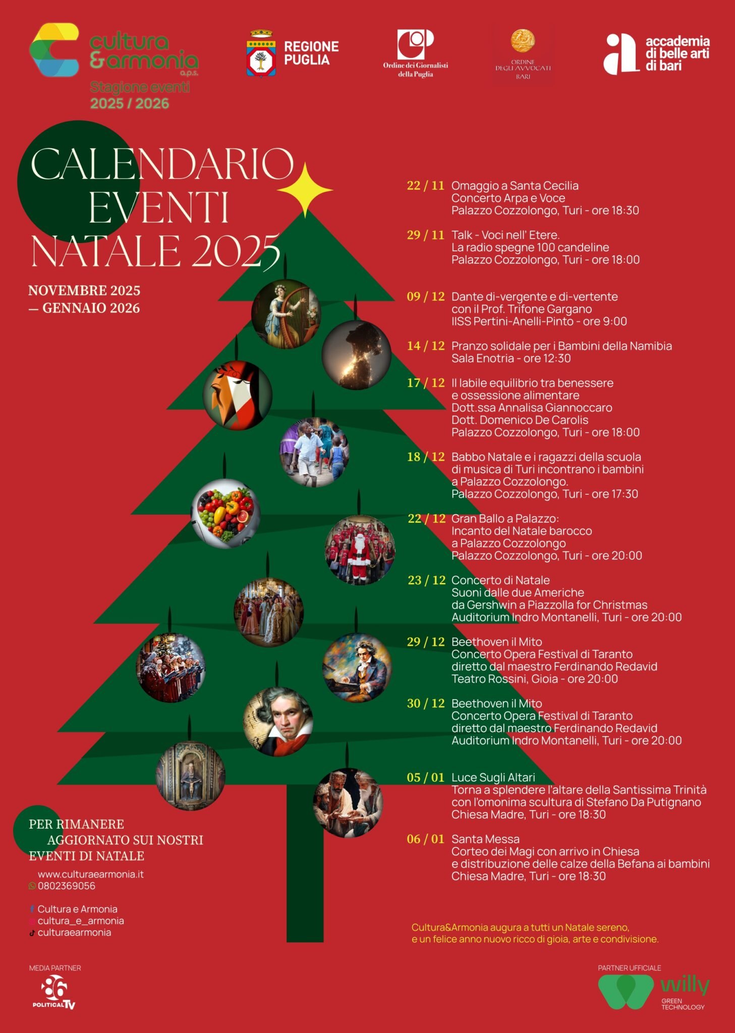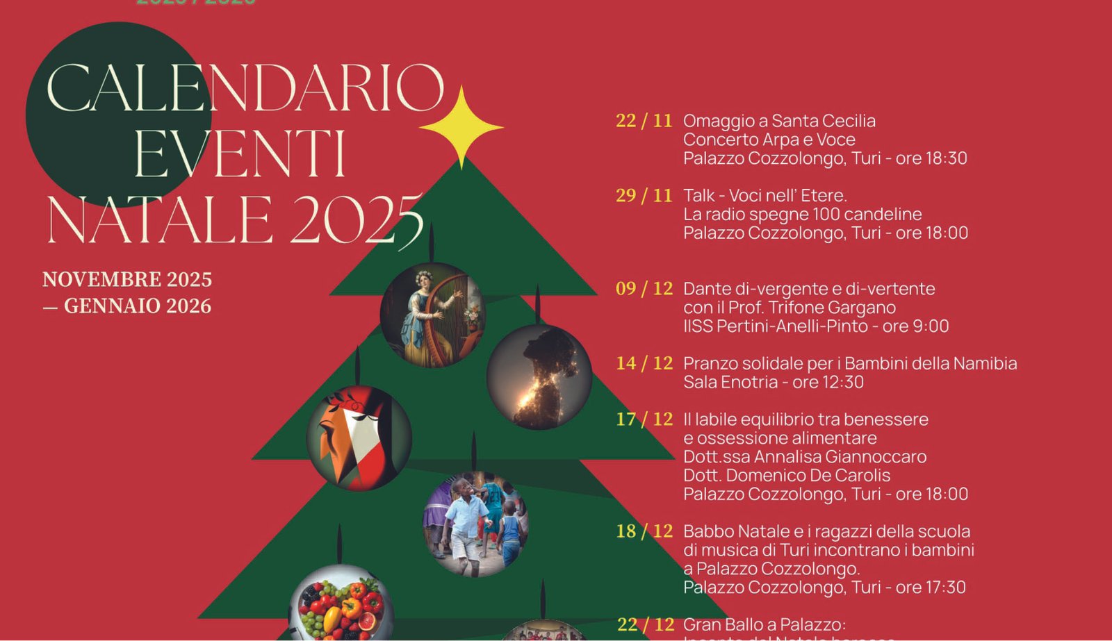 La magia delle feste si accende con Cultura & Armonia A.P.S., che presenta all’interno della sua Stagione 2025/2026 un calendario di Natale ricco di appuntamenti che intrecciano musica, arte, letteratura, solidarietà e tradizione. Dal 22 novembre 2025 al 6 gennaio 2026, Palazzo Cozzolongo e altri luoghi simbolo di Turi e del territorio si trasformeranno in scenari di bellezza e condivisione.
