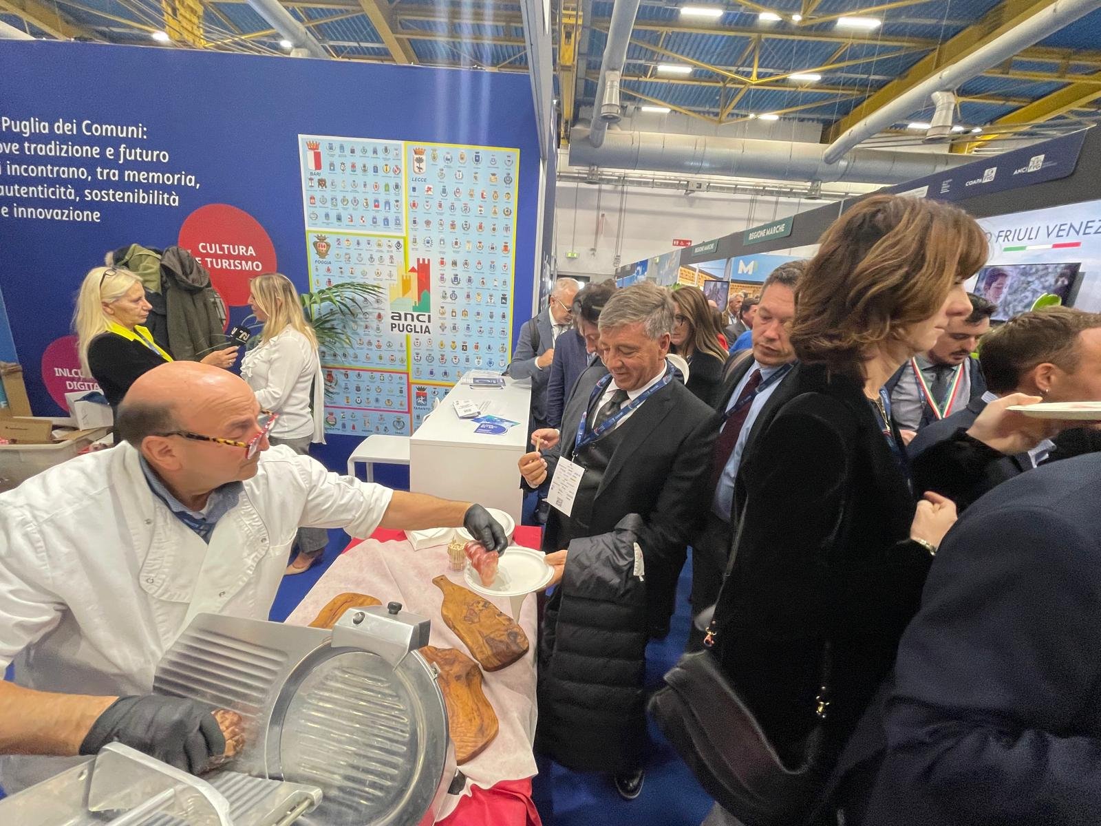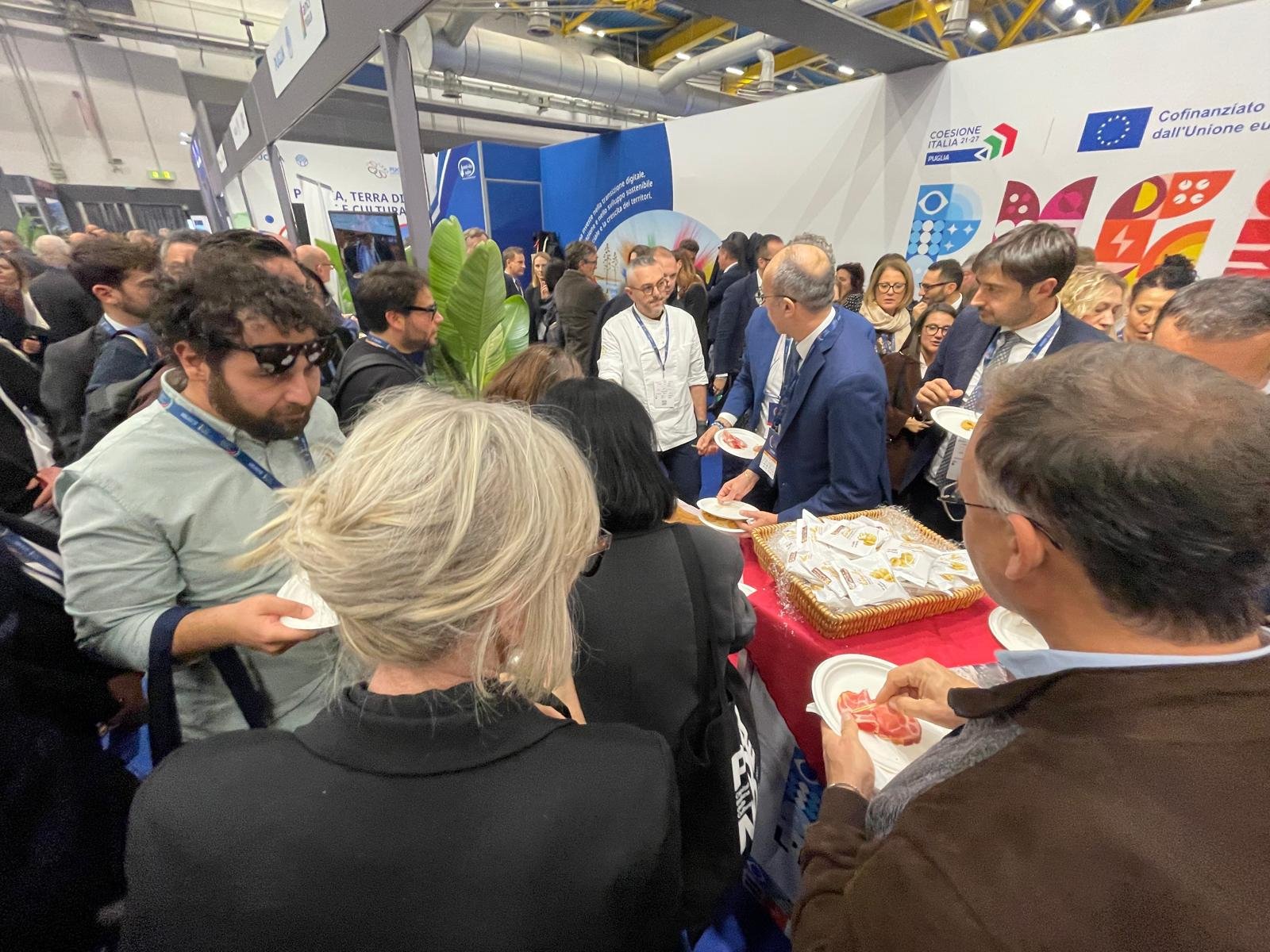 La Regione Puglia ha partecipato con uno stand condiviso con ANCI Puglia e l’Autorità Idrica Pugliese, portando in vetrina alcune delle sue eccellenze più rappresentative. Tra queste, i taralli di Palo del Colle, il rinomato capocollo di Martina Franca, promosso dai produttori insieme allo storico presidente del consorzio Angelo Costantini, e la Faldacchea di Turi, rappresentata da Stefano de Carolis, presidente dell’omonima associazione culturale.