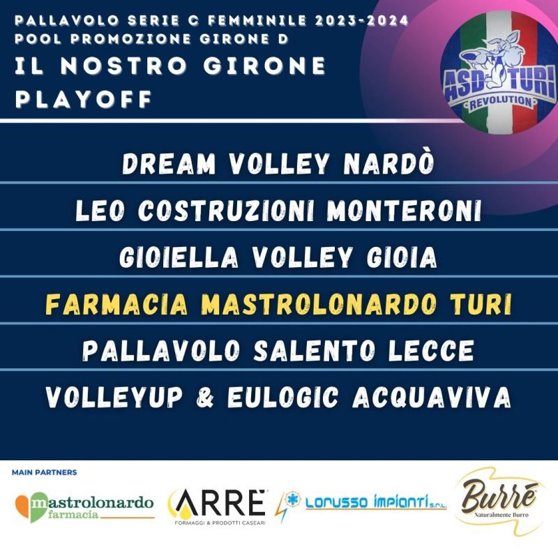 Sabato alle ore 18 al Palazzetto di via Cisterna partono i playoff con la sfida tra la Farmacia Mastrolonardo Turi e la Volley Dream Nardò. Sarà la prima di dieci gare di qui a metà maggio che vedrà le bianco-azzurre turesi affrontare in match di andata e ritorno le salentine Nardò, Monteroni e Lecce e le baresi Gioia ed Acquaviva. Le prime due classificate accederanno alle semifinali promozione che designeranno poi l’unica promozione al prossimo torneo di serie B2. Il primo avversario per il Turi sarà dunque il Nardò vincitore nella prima fase del girone leccese avendo ottenuto ben 46 punti con 15 successi e solo una sconfitta, seria candidate al salto di categoria. Per la Farmacia Mastrolonardo sarà una gara sicuramente complicata ma da giocare con animo sereno non avendo nulla da perdere.