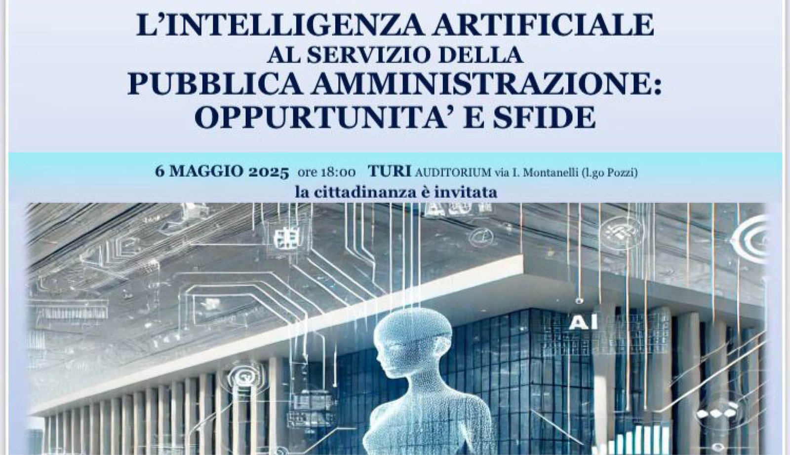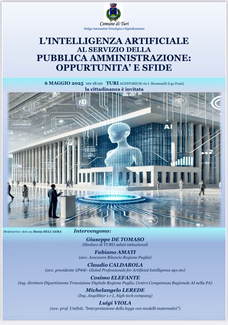 L’Amministrazione Comunale, a cura del Consigliere delegato alla Innovazione Tecnologica e Digitalizzazione, è lieta di proporre un incontro aperto a tutta la cittadinanza dedicato a comprendere come l’Intelligenza Artificiale possa interagire con i meccanismi della Pubblica Amministrazione.