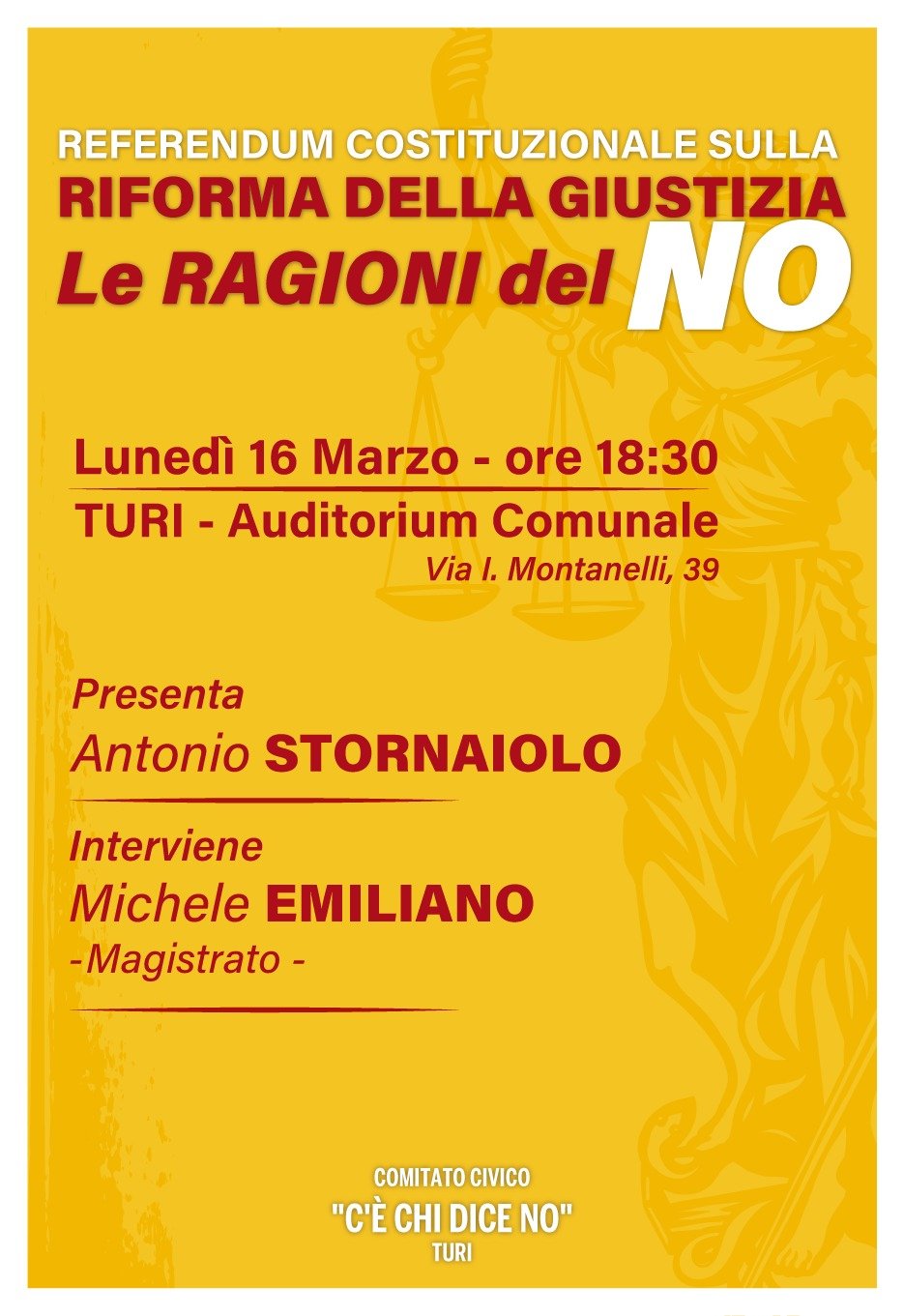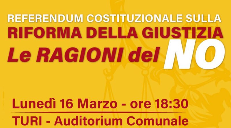 Nell’Auditorium Comunale di Turi si ritorna a parlare di giustizia e di Costituzione. Lunedì 16 marzo, alle ore 18.30, il Comitato civico “C’è chi dice NO” promuove un incontro pubblico per discutere del referendum costituzionale sulla riforma della giustizia e approfondire le ragioni del NO.
