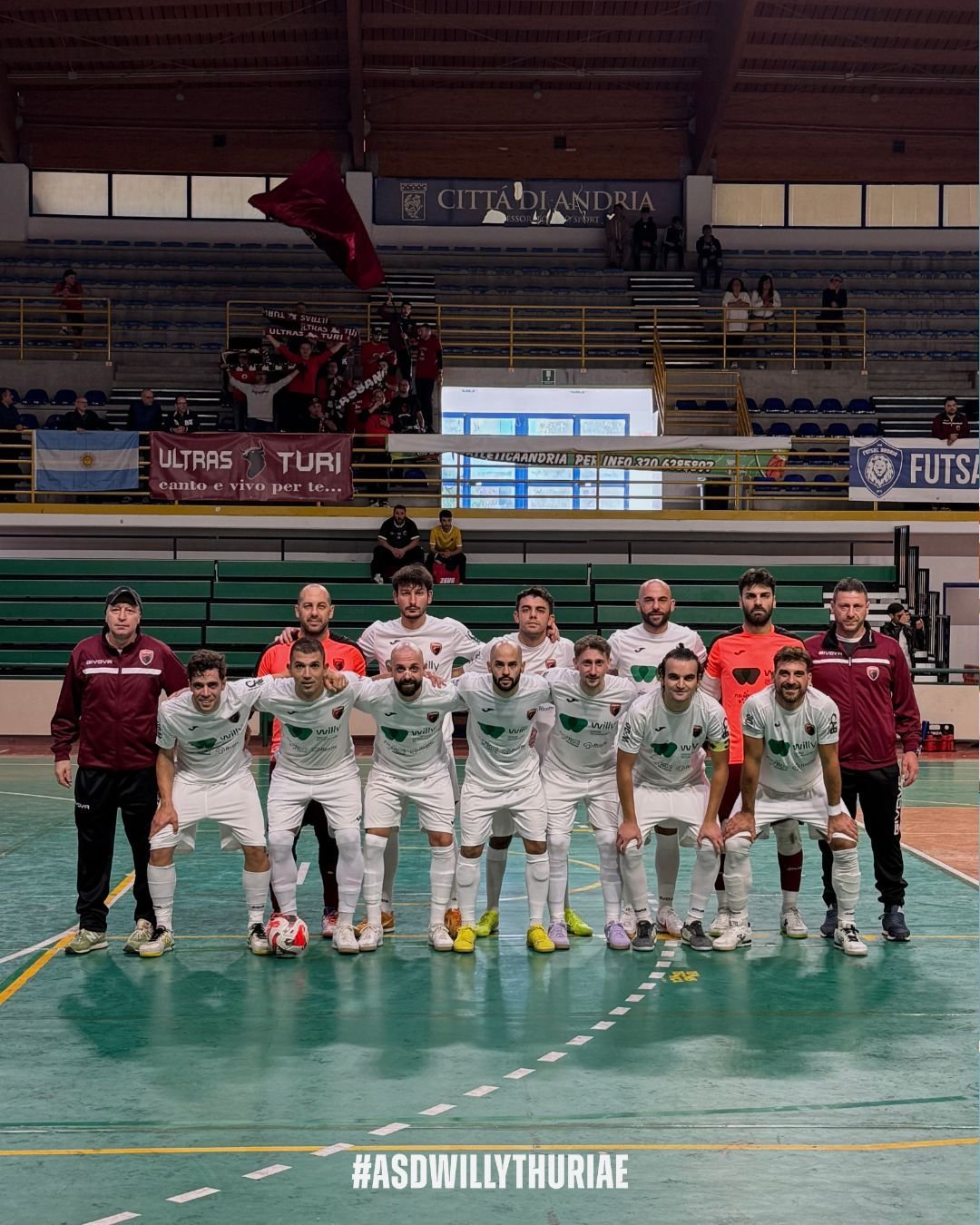 Con gli indisponibili Valentini, Balena e Di Pinto, mister Di Bari si affida al quintetto composto da Denovellis, Ciavarella, Banegas, Campagna e Ritorno. Sono proprio Denovellis e Ciavarella a rendersi pericolosi nei primi minuti, ma le loro conclusioni non impensieriscono il portiere di casa. La Willy Thuriae continua a cercare la via del gol, ma la retroguardia andriese si dimostra attenta e ben organizzata. A metà del primo tempo arriva il primo squillo dell’Andria, che sblocca la gara con un’azione ben costruita: 1-0. I turesi non si abbattono e reagiscono con determinazione, sfiorando il pareggio in più occasioni, in particolare con Campagna, fermato solo da un intervento miracoloso del portiere avversario. Tuttavia, nel finale di frazione, la Florigel colpisce ancora: ripartenza fulminea e raddoppio a pochi secondi dal fischio dell’intervallo. Nella ripresa il copione non cambia. La Willy Thuriae spinge, ma l’Andria si difende con ordine e colpisce in contropiede. Ritorno ha l’occasione di riaprire il match, ma viene ipnotizzato dal dischetto dall’estremo difensore andriese. Col passare dei minuti cala la lucidità dei rossogranata e la Florigel ne approfitta per calare il tris. Solo nel finale arriva il gol della bandiera con Ritorno, che insacca su assist di Banegas.